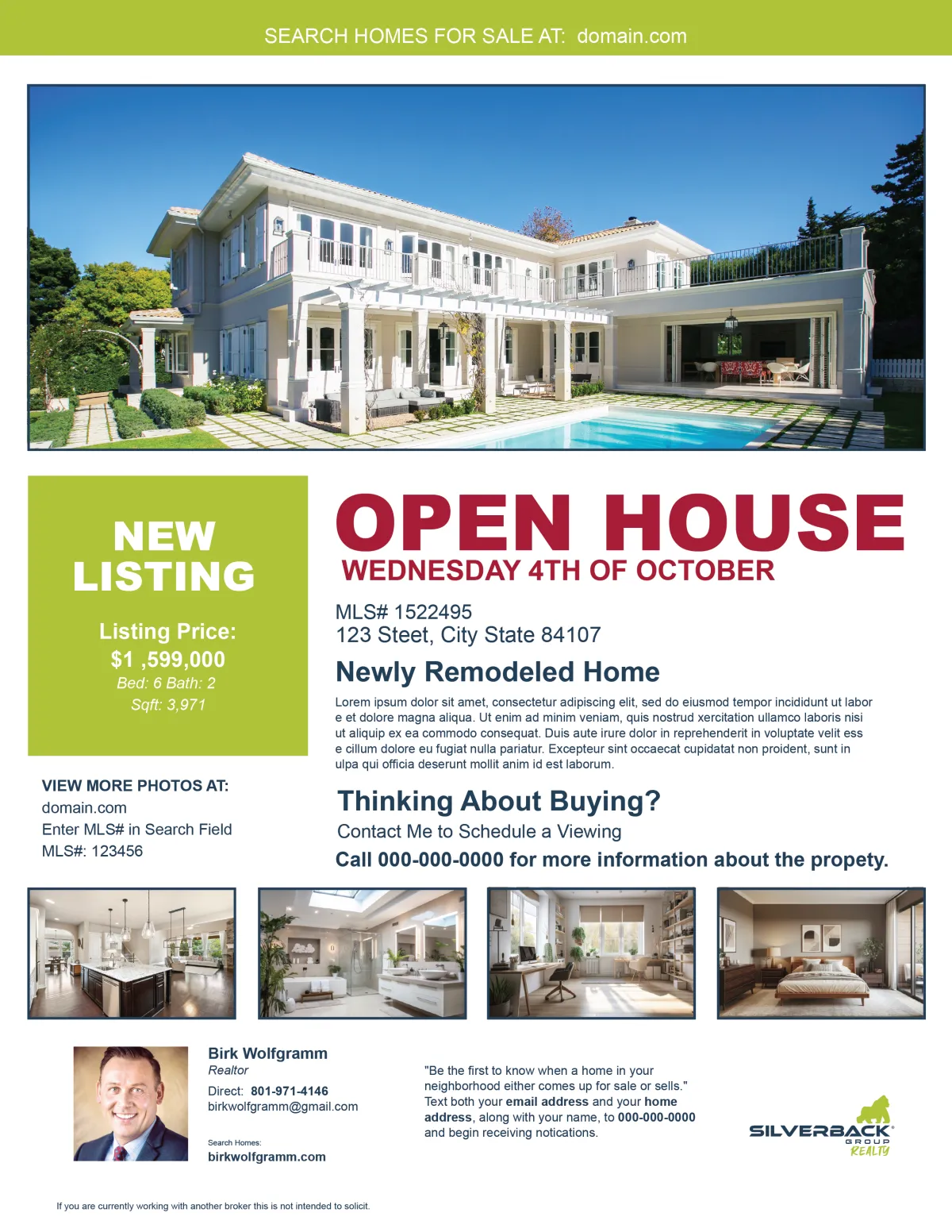 Our open house flyer is designed to highlight your home’s key features and create a lasting impression. Professionally designed and strategically distributed, it attracts local interest, drives traffic to the event, and gives potential buyers something tangible to take with them.