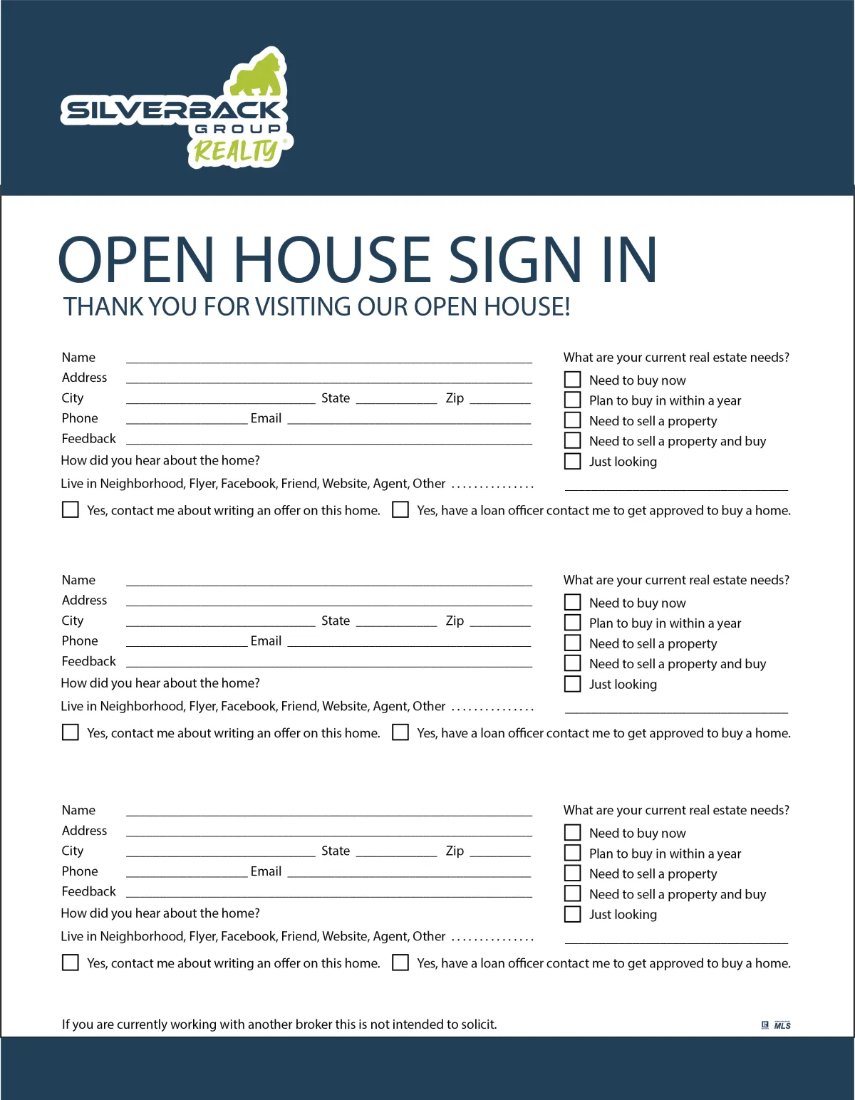 The sign-in form helps us capture key information from potential buyers during open houses. By collecting their contact details, we can follow up with them after the event, provide additional property information, and ensure we’re targeting the right buyers for your home. This form also serves to track visitor interest, giving us valuable insights for future marketing efforts.