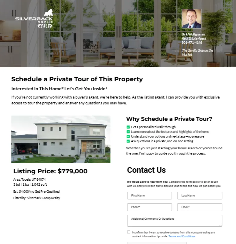 The "Request a Private Tour" page provides potential buyers with an easy way to schedule a one-on-one viewing of your property. This personalized approach allows us to give serious buyers an exclusive experience, answering their specific questions and showcasing your home in the best light. It also helps us qualify leads and ensure your home gets the attention it deserves.